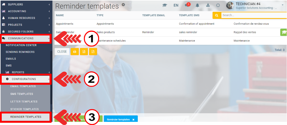 To see the list of reminders, click on Communications > Configurations > Reminder templates.