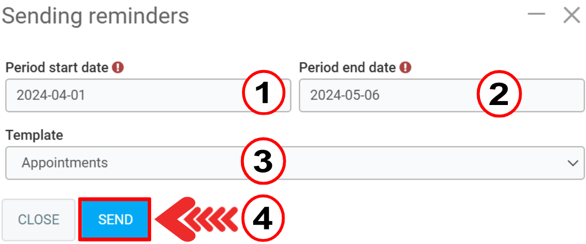 Select the desired delivery method for sending reminders: SMS, email or letter format to print.