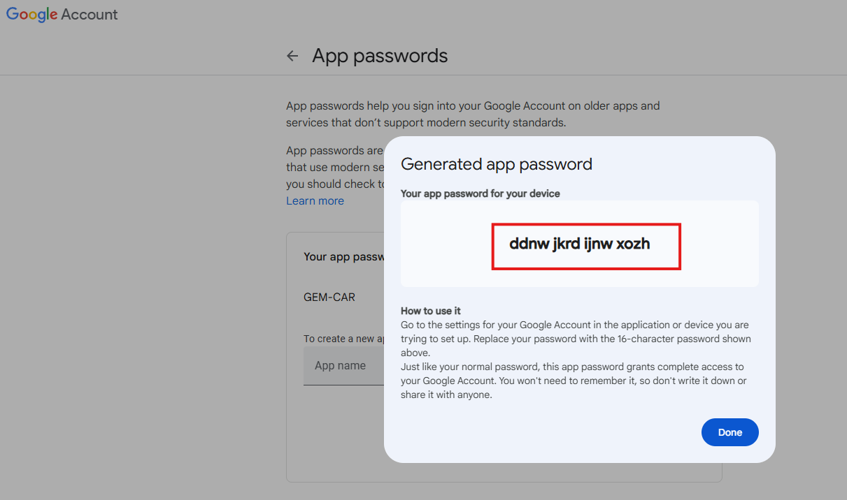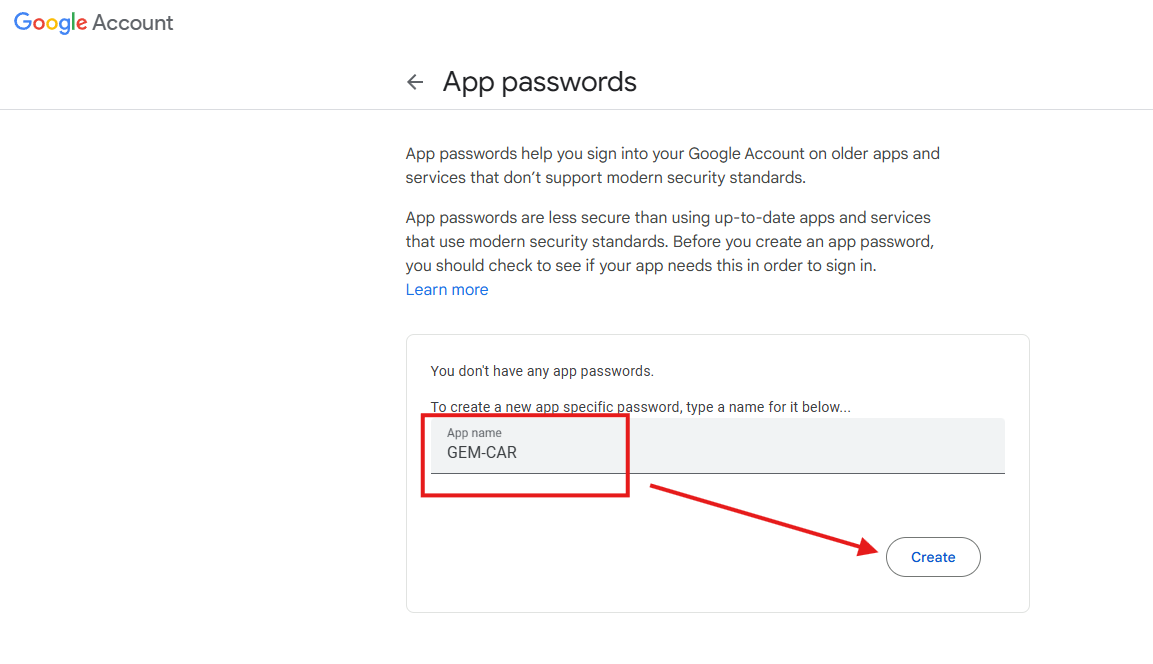 For Google, to create an app password, click here. Then, enter a name in the space like GEM-CAR and press Create.