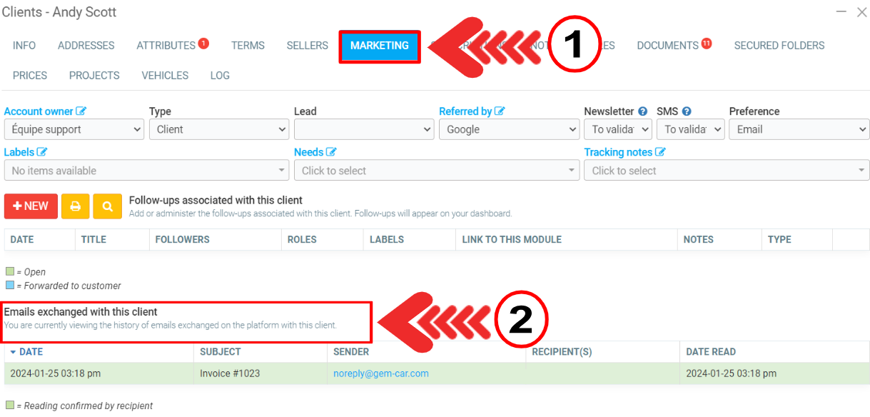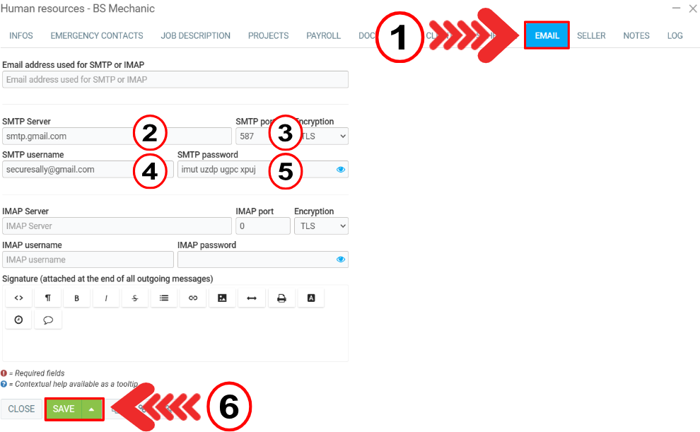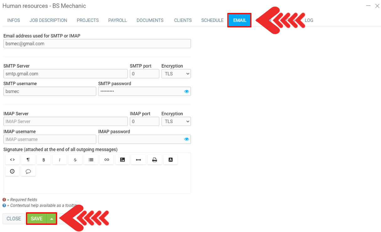 The IMAP section is optional but very useful for the Marketing tab, section "Emails exchanged with this client".