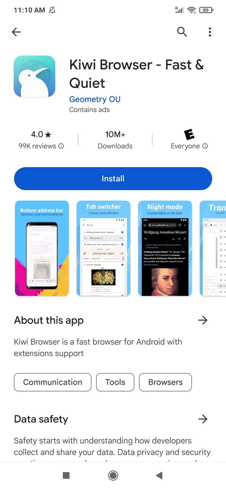 Search for Kiwi Browser, select it, click on the blue button "Install".