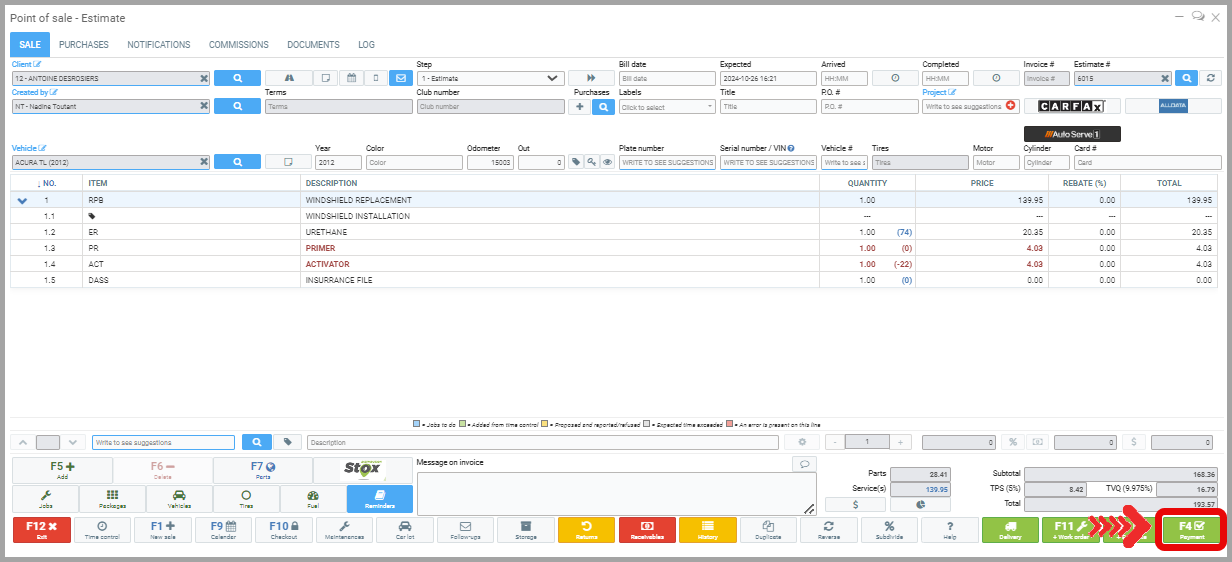 From the Point of Sale, complete the estimate with the required work and parts for the repair.