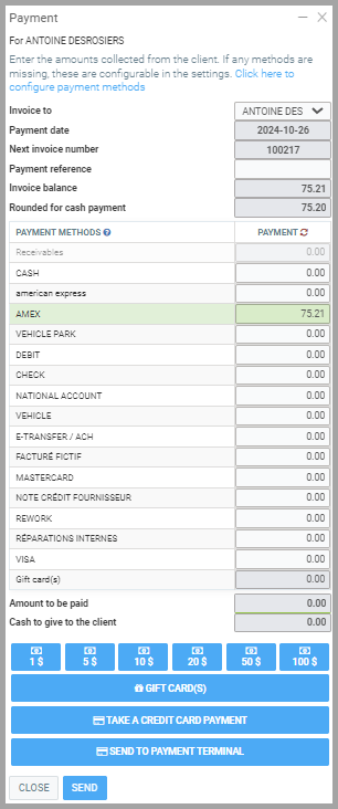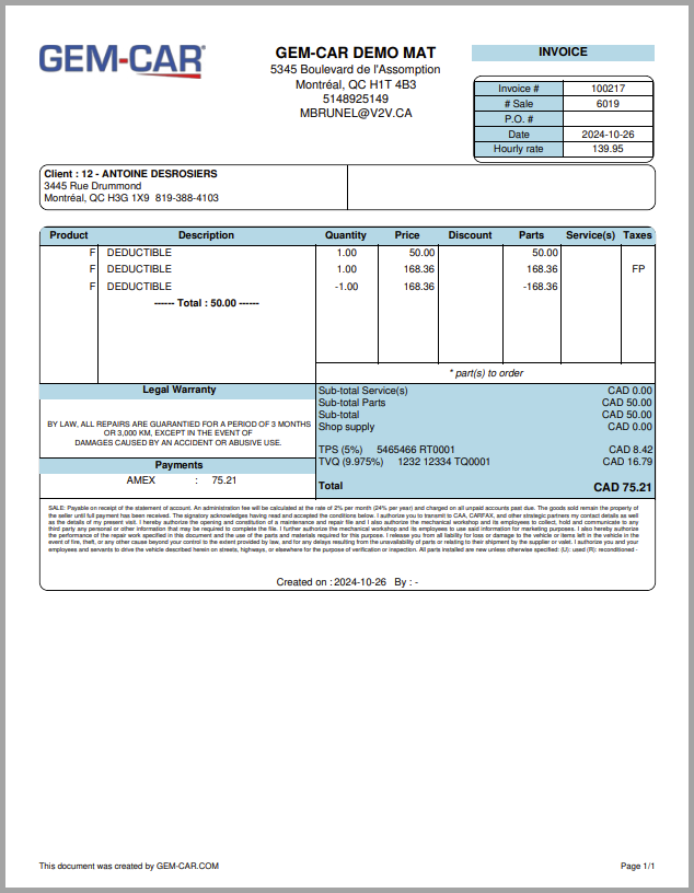 This invoice is intended for the insurer. That is why the amount of the deductible paid by the client appears as a negative on the invoice, so it won’t be paid twice.