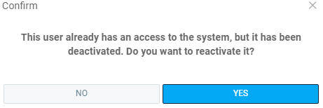 If you wish to reactivate access, click on the key again and confirm Yes in the confirmation window which appears with the message: “This user already has access to the system, but it has been deactivated. Would you like to reactivate it?