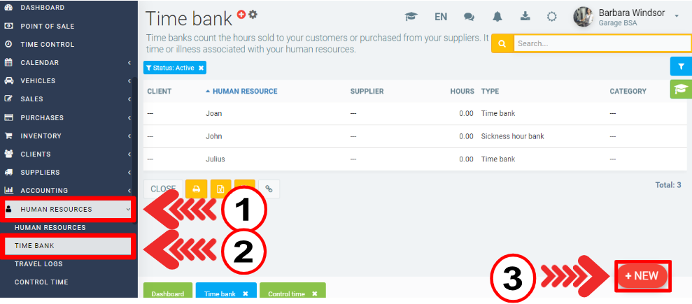 To create a bank of hours, go on the left menu, click on Human Resources > Time bank > +New.