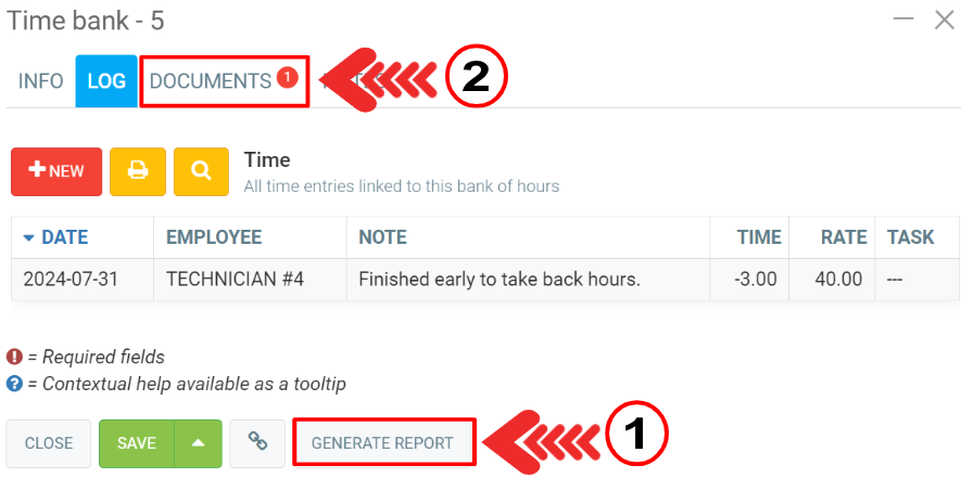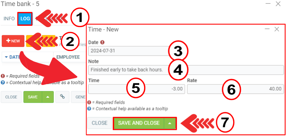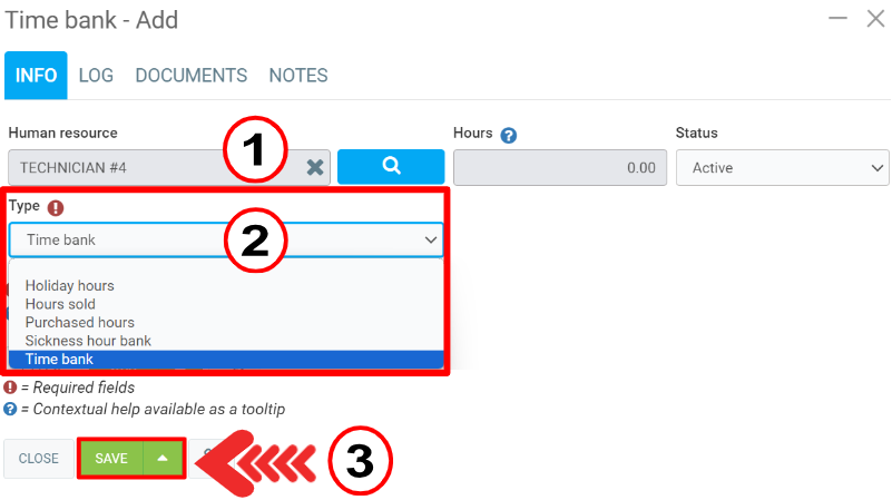 - Type (holiday hours, hours sold, purchased hours, sickness hour bank, time bank).