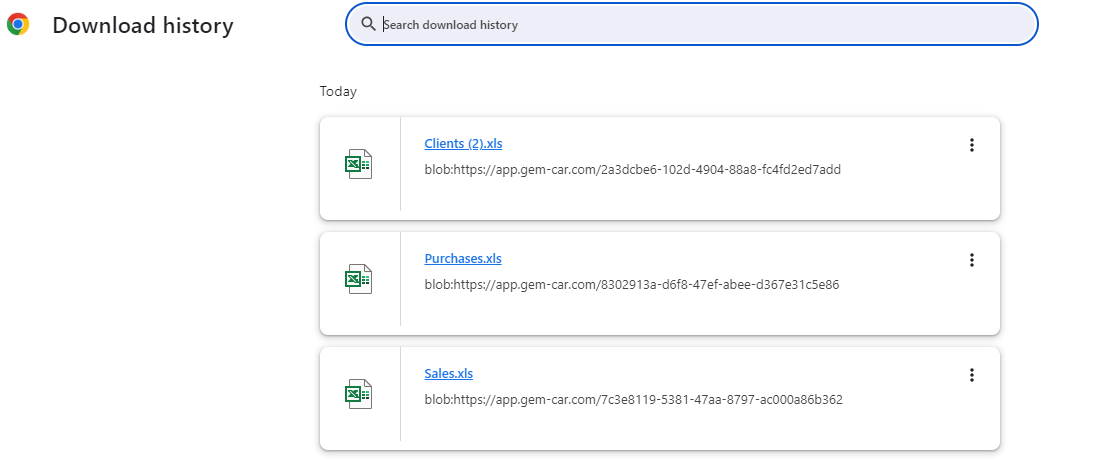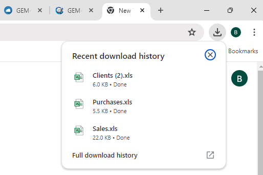 If you click on the "Full download history" button that appears at the right end of this bar, a new tab will open and the complete list of Excel files created during data exports will be presented.
