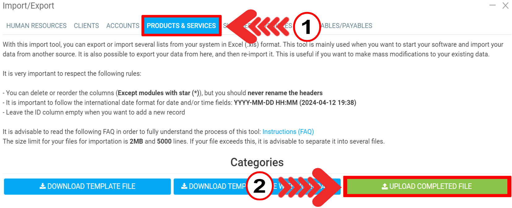 For each tab, a template file (in Excel format) is provided to you in order to import your data.