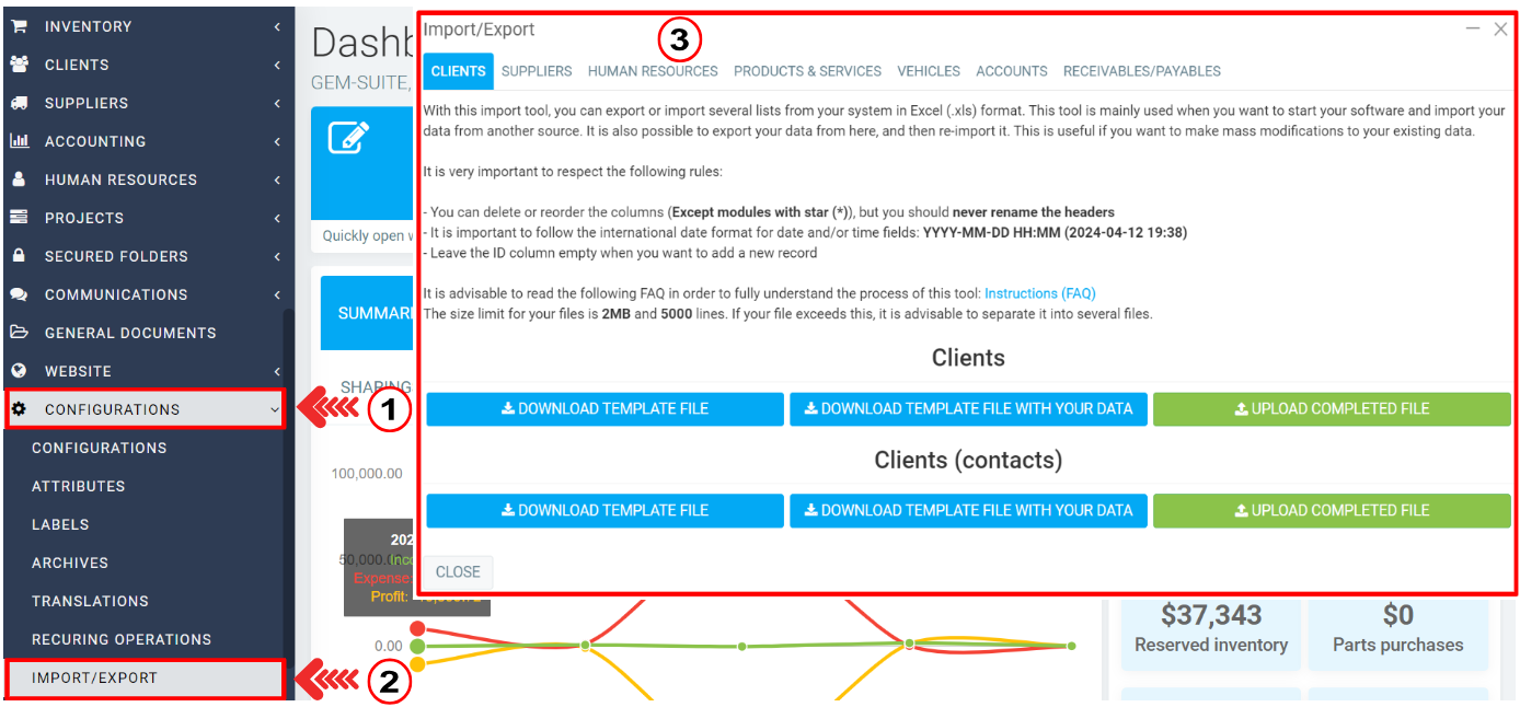 If you are connected to GEM-CAR with a user who has the "Data import" right on their role, you will have access to the Configurations > Import/Export.