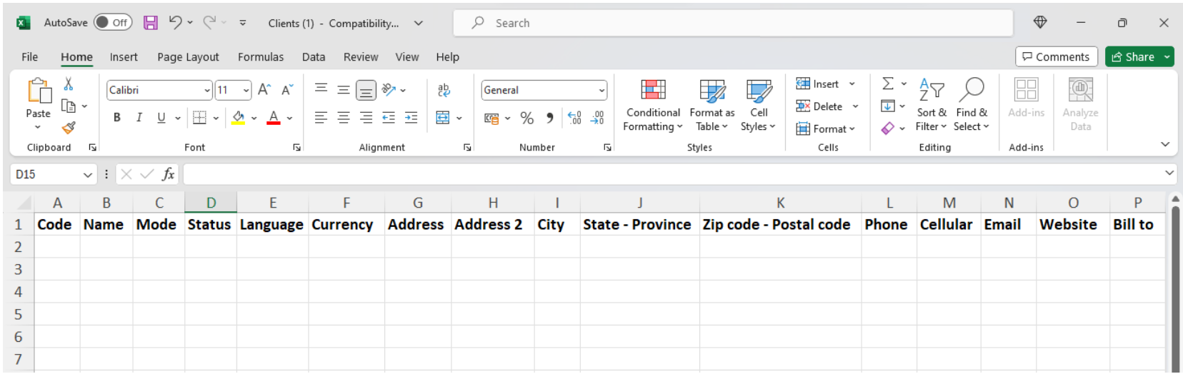 In the case of customers, when you click on Download template file, the information transferred will be as follows: