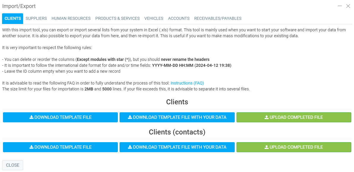 For each tab, a template file (in Excel format) is provided to you in order to import your data.