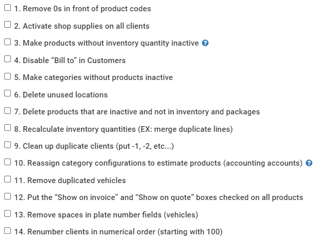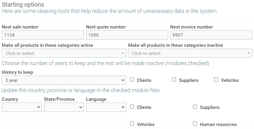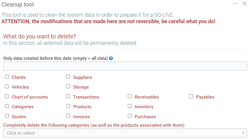 - You can check multiples boxes: Clients, Suppliers, Vehicles, Storage, Chart of accounts...