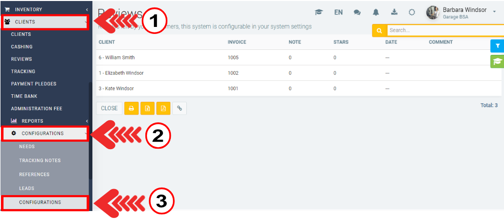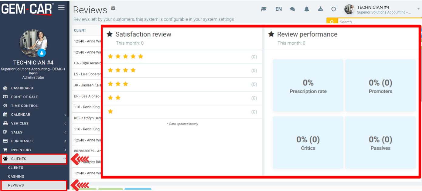 Click on Clients > Reviews or on the dashboard Satisfaction review and Review performance.