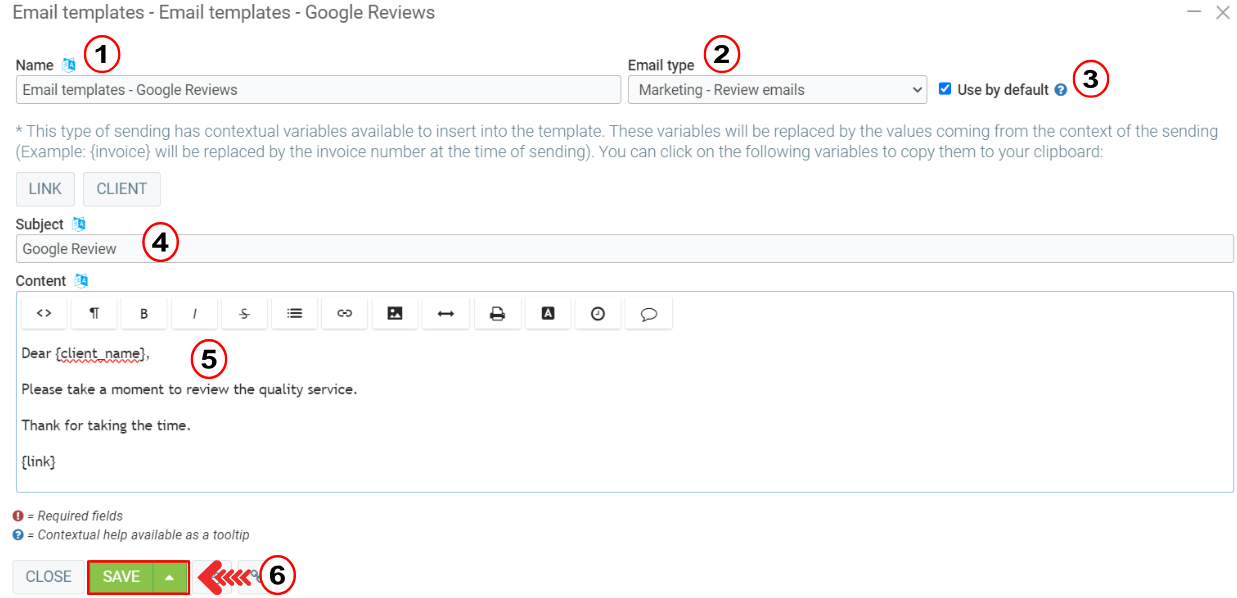 In the next window, enter a title such as Email templates - Google Reviews, create an email type Marketing - Review emails, check the box Use by default, enter the subject, the message and then click on Save.