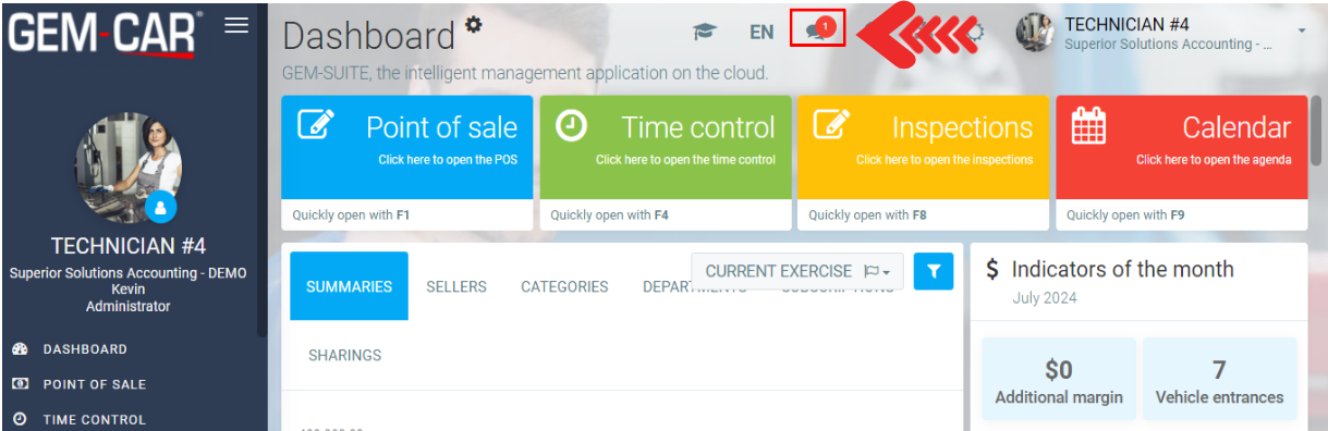 When using the online version, if you receive messages from customers or employees, a small red bullet indicating the number of messages appears in the top right corner of the screen.