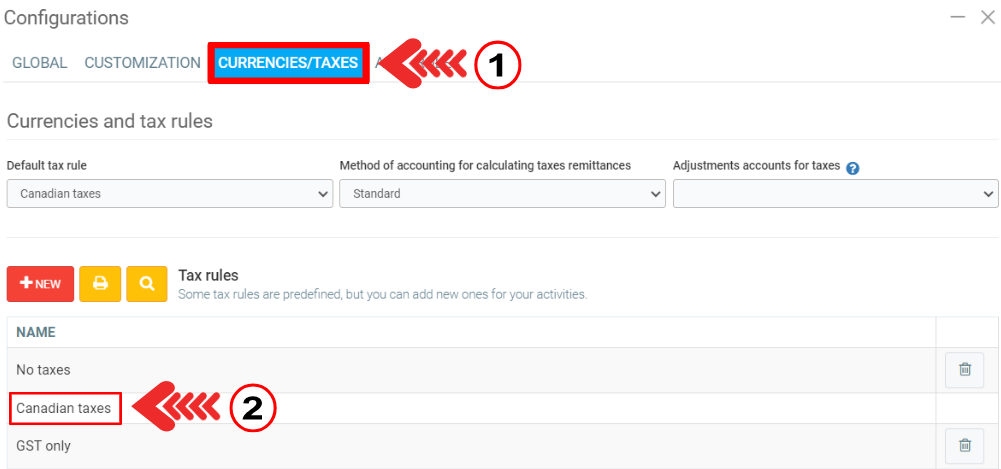 - Go to the left-hand menu under Configurations > Configurations > Currencies/Taxes tab.