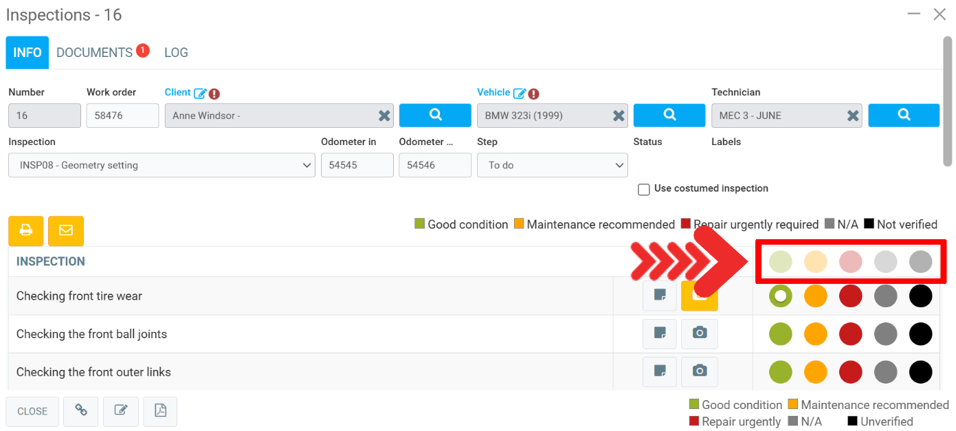 On the inspection form and for each item, select the dot corresponding to the evaluation of the aspect inspected. Here is a copy of the legend: