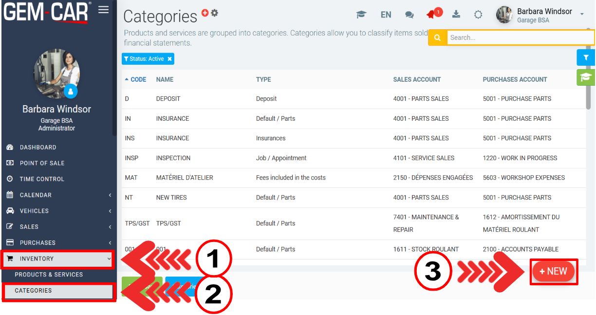 In the left side menu, click on Inventory > Categories > +New (on the bottom right side of the screen).