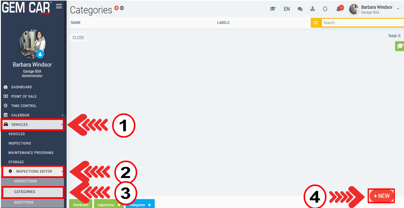 In the Vehicles > Inspections editor > Categories > + New tab, you can create new categories for your inspections.