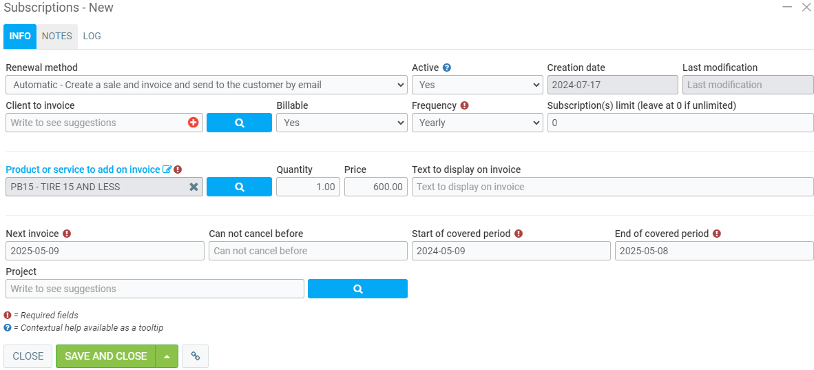 As a conclusion, if you had wanted the coverage interval displayed on the invoice to be from June 1, 2024 to June 30, 2025, you would have had to indicate June 1, 2023 to June 30, 2024 on the first screen since the system adds 1 year before creating the subscription.