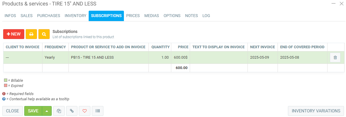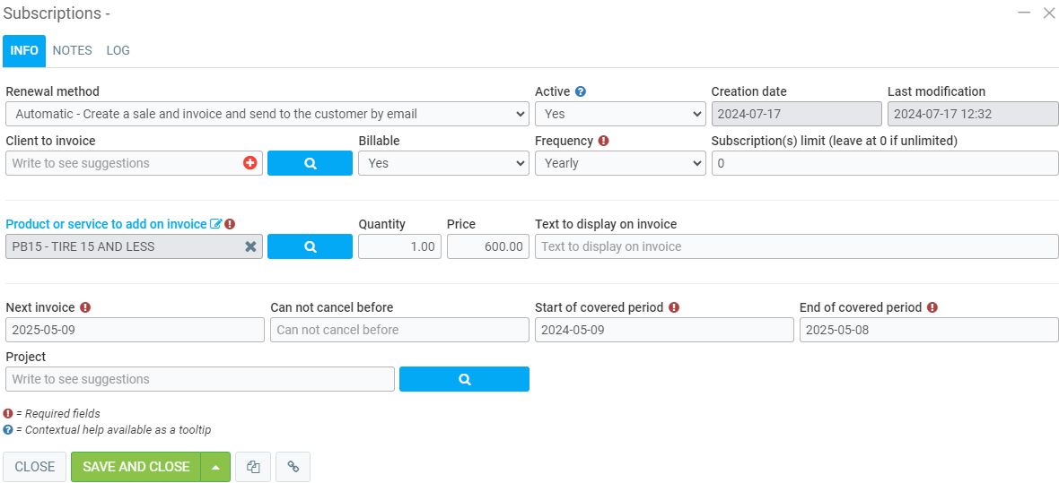 Note that the system added 1 year to the three dates before generating the sale. If you open the subscription on May 16, 2025, you will get this: