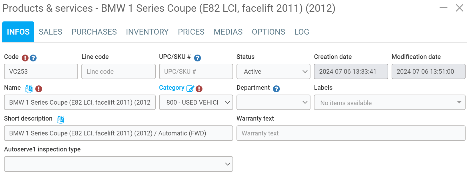 To verify what repairs have been made to used vehicles available for renting, click on Inventory > Products and Services.