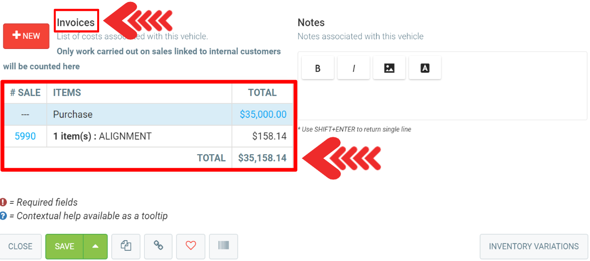 The Invoices section displays a list of your repair invoices for the vehicle.