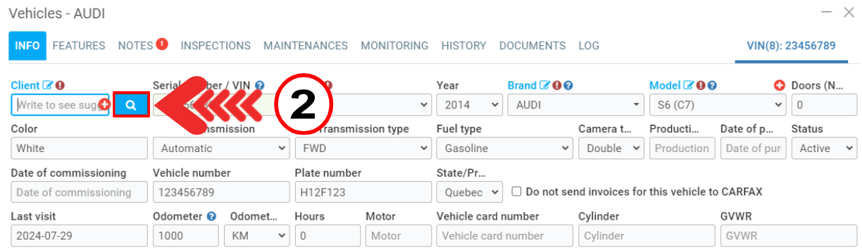 - add another client to the vehicle's file by clicking the magnifying glass and then, selecting one or creating a +New one.