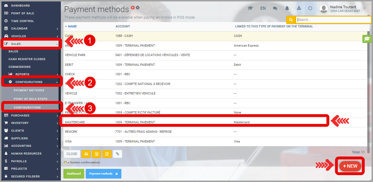 - To modify your payment methods, from the main menu on the left of the application, click on Sales > Configurations > Payment methods.