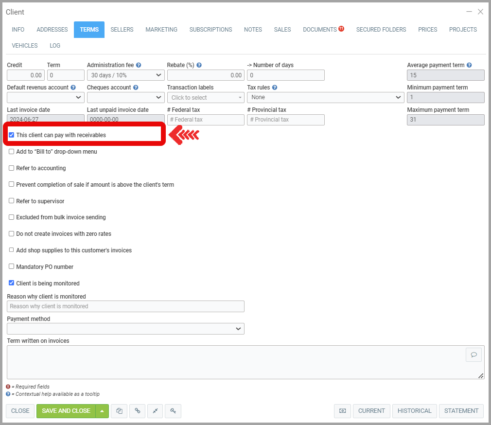 Note: If the Send button is not clickable at this stage, it is very likely that the client you are sending the invoice to is not authorized to pay by receivables (under the Terms tab in their Client file). See Creating a New Client for more details.