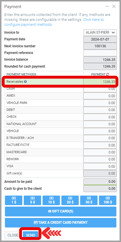 - For the Payment Method To Be Received, enter the amount to be paid and click on Send.