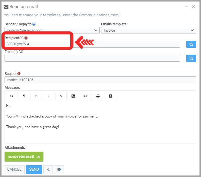 Enter the email address where you want the invoice to be sent, in the Recipient(s) section, and click on Send. If the window does not open automatically, you can find the invoice under the Documents tab of the sale and click on the envelope icon located on the same line as the document.