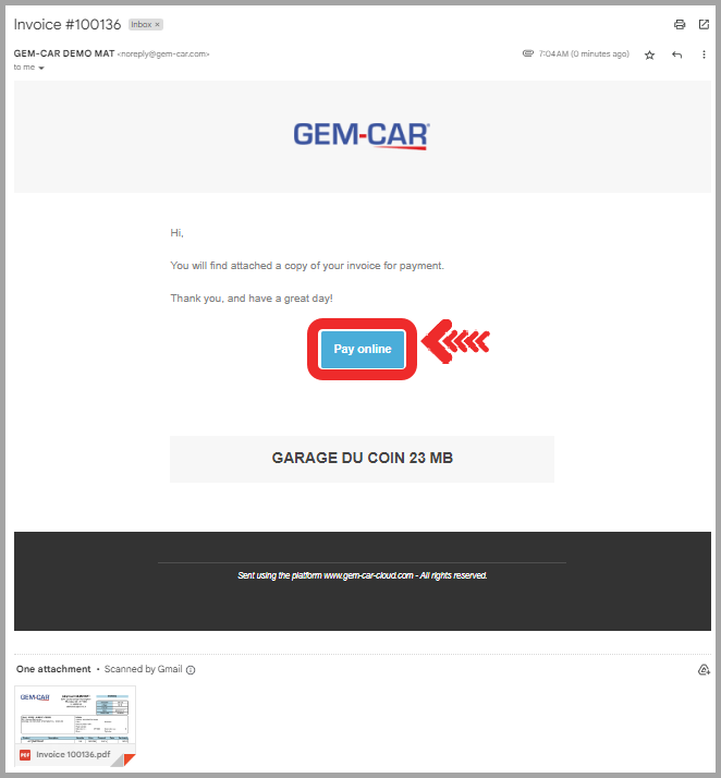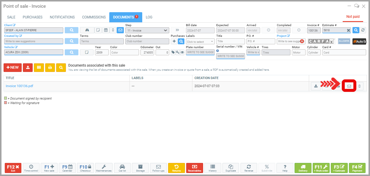 The invoice now appears in red in the Documents tab of the sale. The envelope is yellow, indicating that the invoice has been sent, and turns green once read. To access the invoice or request payments again, click on this envelope.