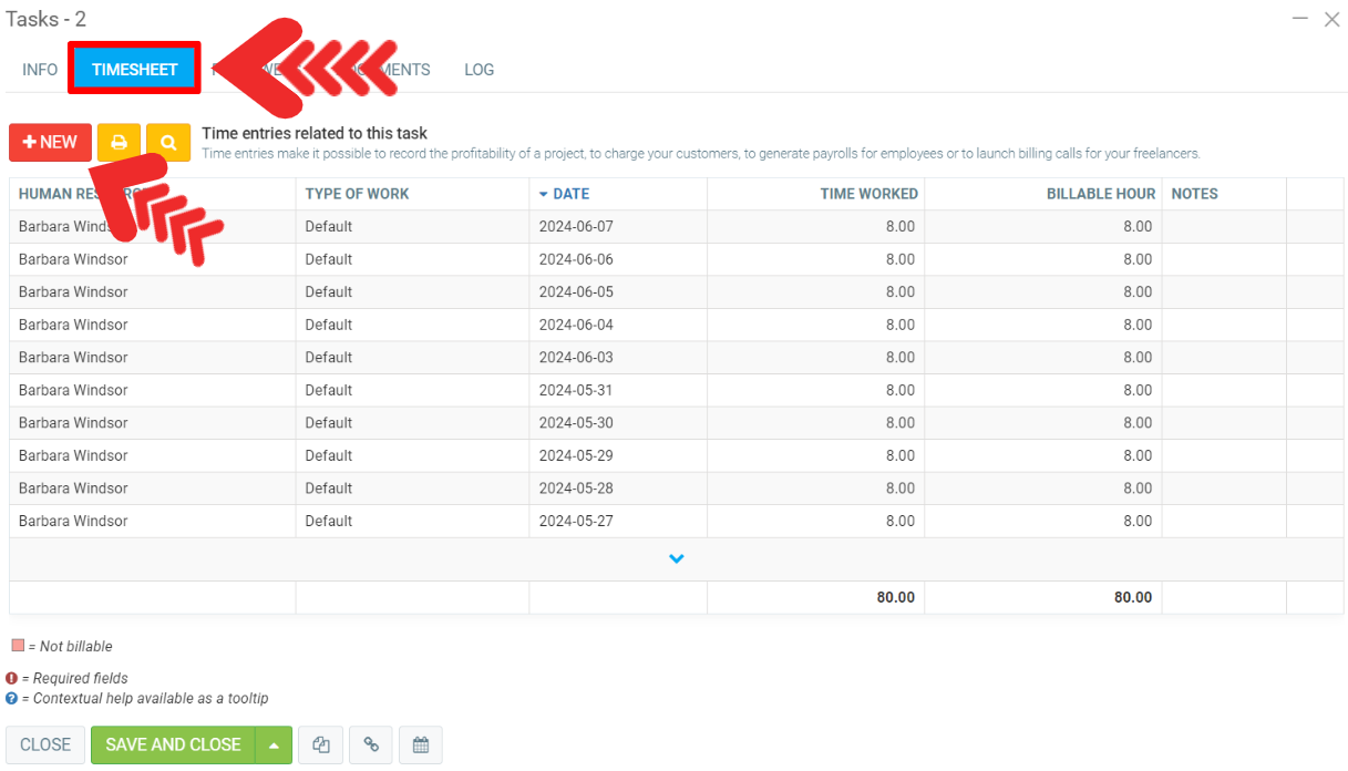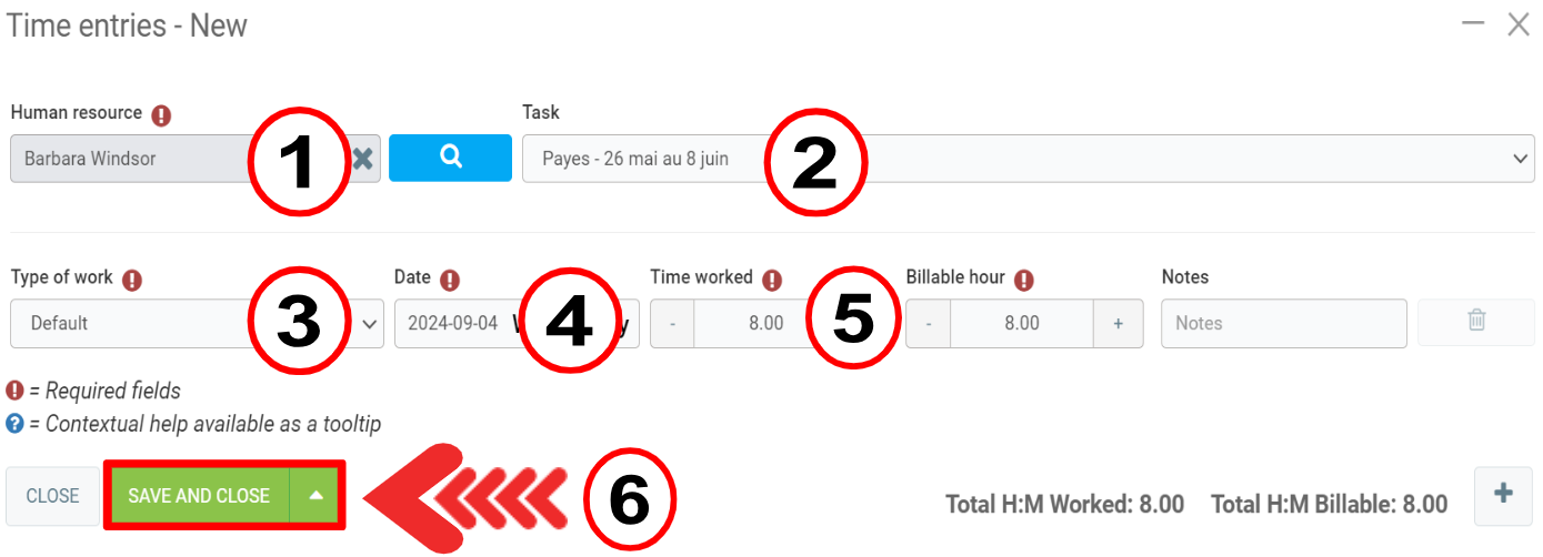 - Select the Date the Human Resource worked on the task and the Time Worked.
