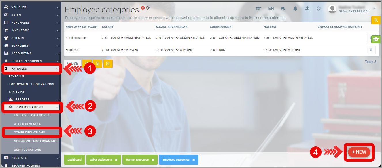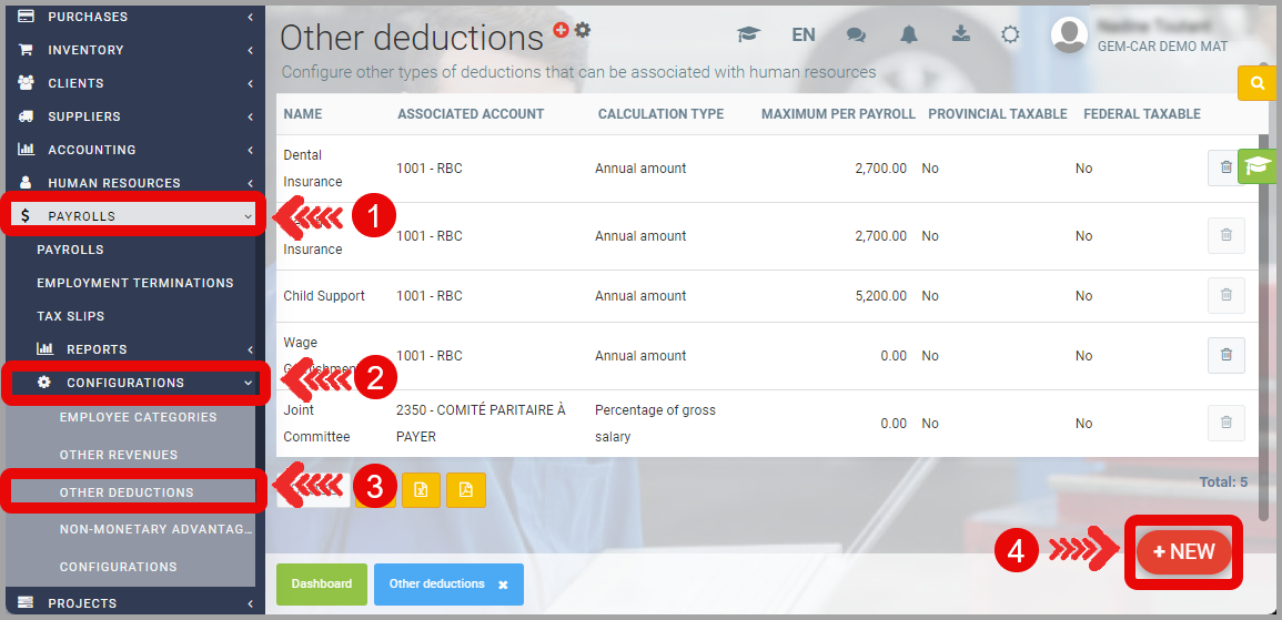 Under the Configurations tab, for Other Deductions, click on +New.