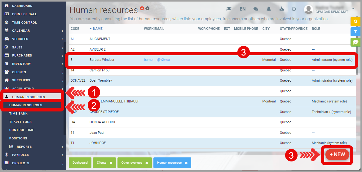 - In the left menu, click on Human Resources > Human Resources > +New or select the human resource you wish to modify.