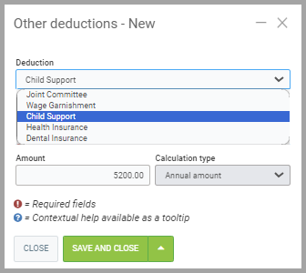 - For a deduction, it is possible to configure whether it is calculated annually, hourly, or as a percentage of the gross salary. When setting up payroll for a human resource in the next step, you can enter the amount in money or percentage according to the configuration specified here.