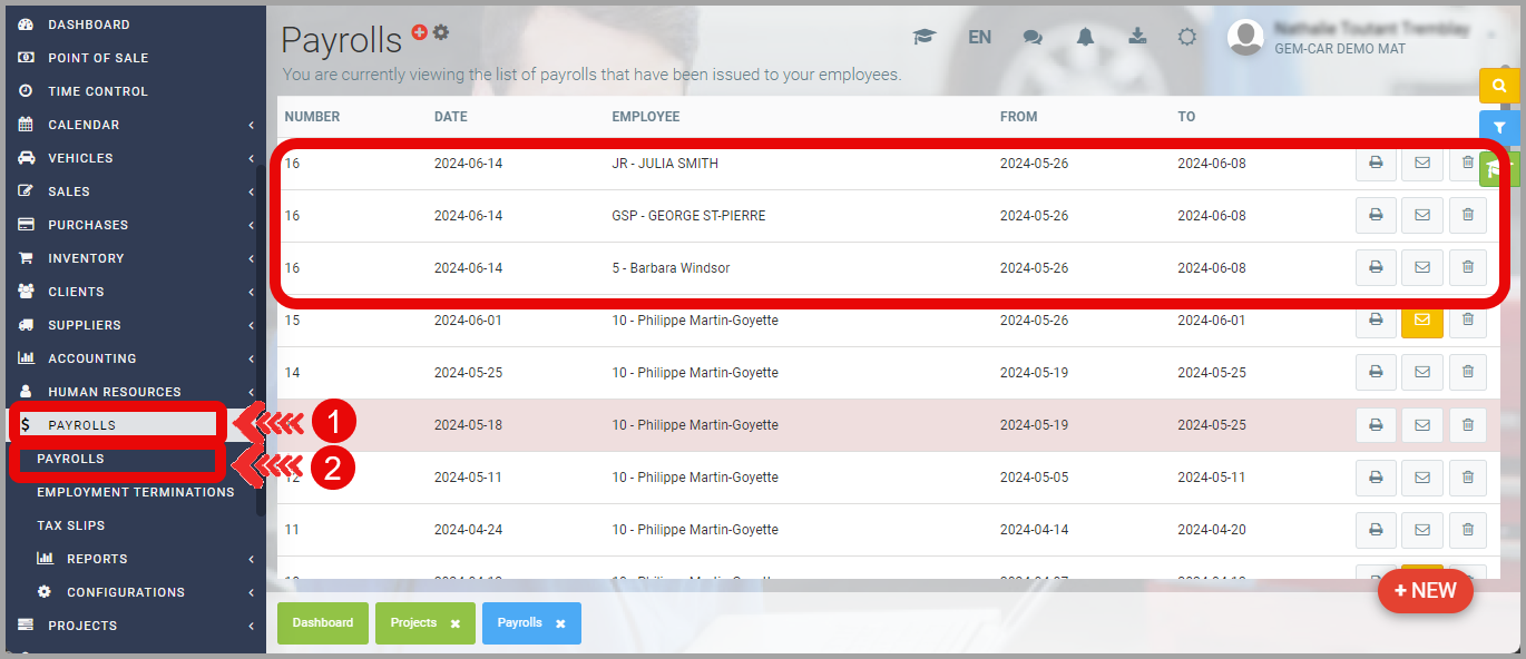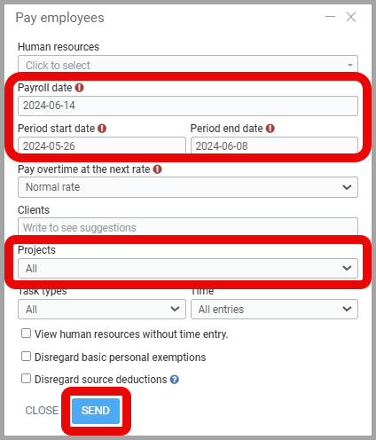 - From the main menu, click on Projects > Pay Employees.