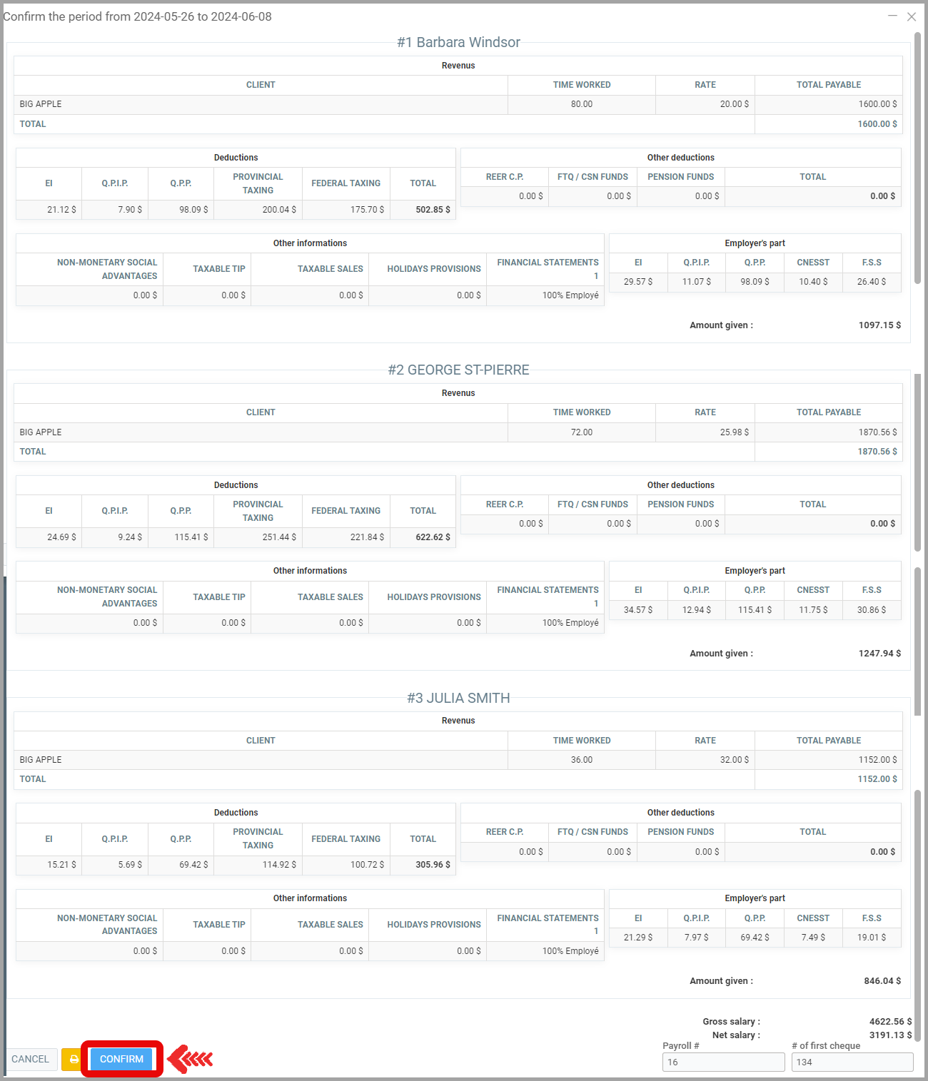 - Select and confirm the specific hours you want to include in the Payroll Report, which will be used to calculate each employee's final salary.