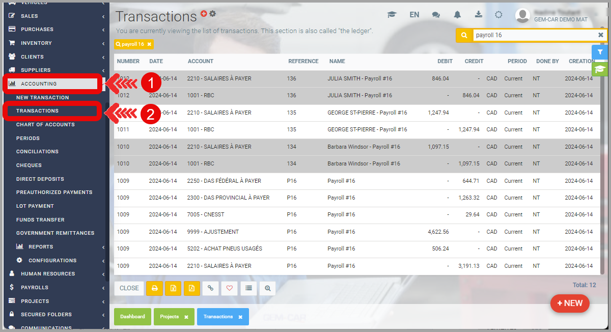 - To view transactions related to payroll payments, from the main menu on the left of the application, click on Accounting > Transactions.