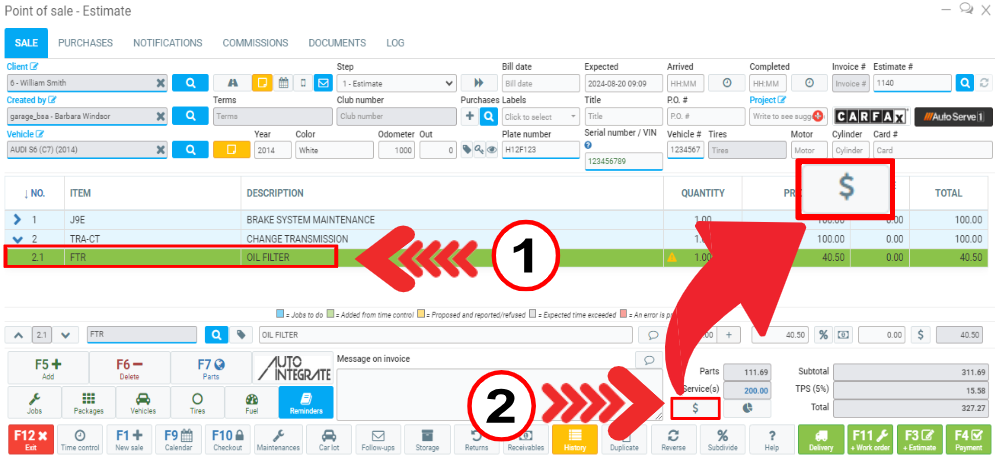 Then select the product for which you wish to modify the tax, and click on the $ symbol in the right-hand corner of the Point of sale, below the Parts and Services prices.