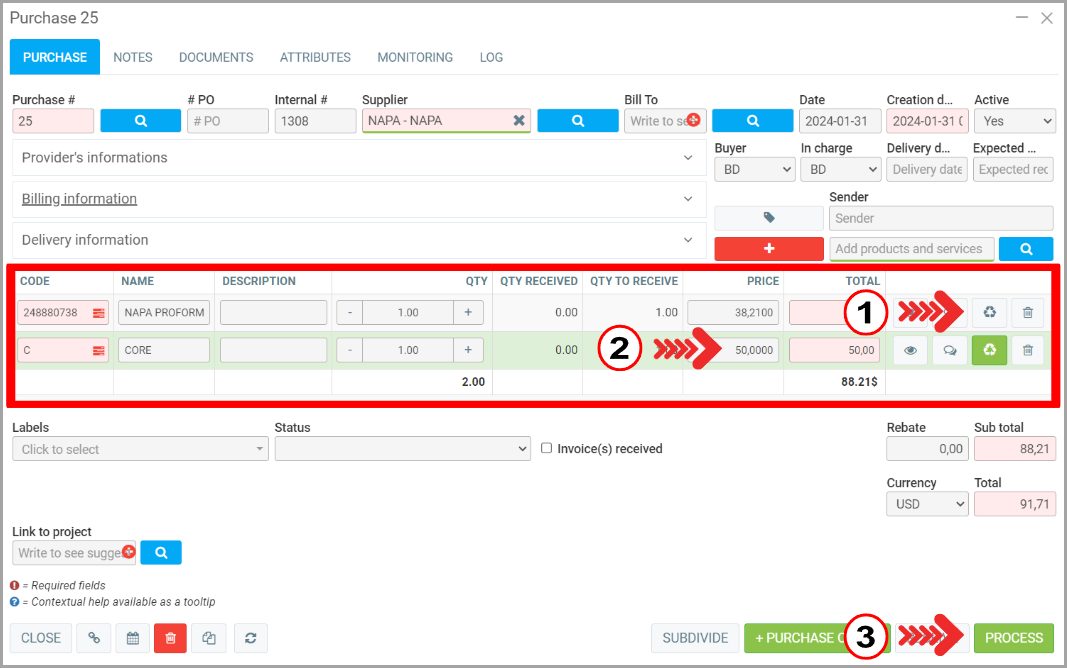 Then, add a Purchase to the selected product by clicking on the button plus. Another window will open.
