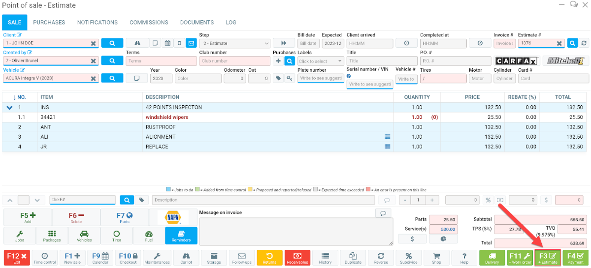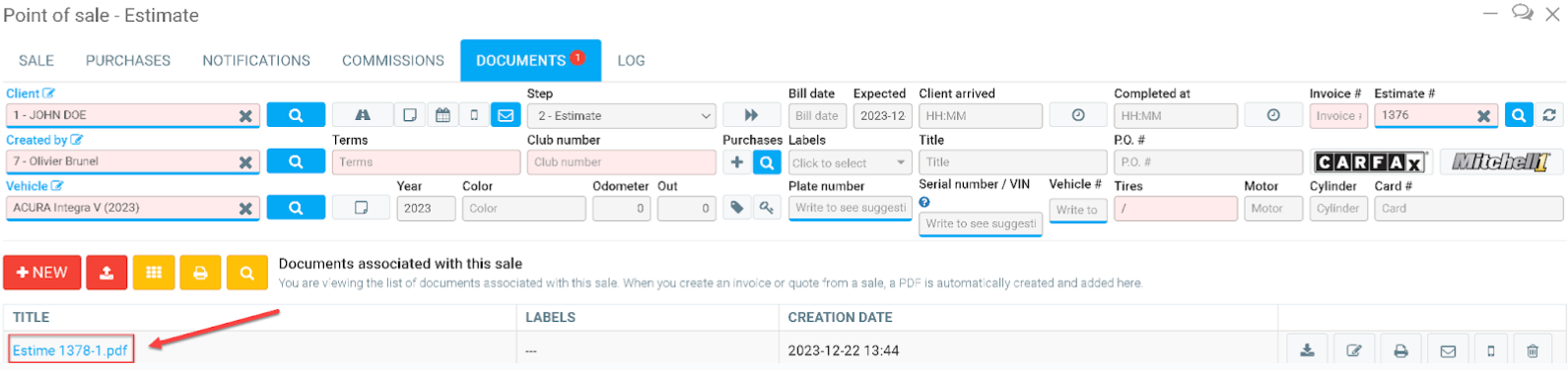 GEM-CAR will bring you to the documents tab and you can now your estimate, and its number as a pdf in the documents tab.