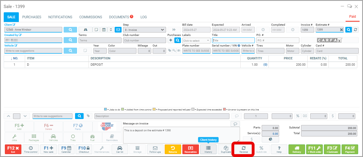 When the deposit invoice is reversed, the deposit must be manually removed from the tire sale.