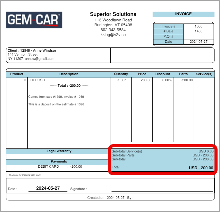 Important note: The deposit is not automatically removed from the original sales invoice.