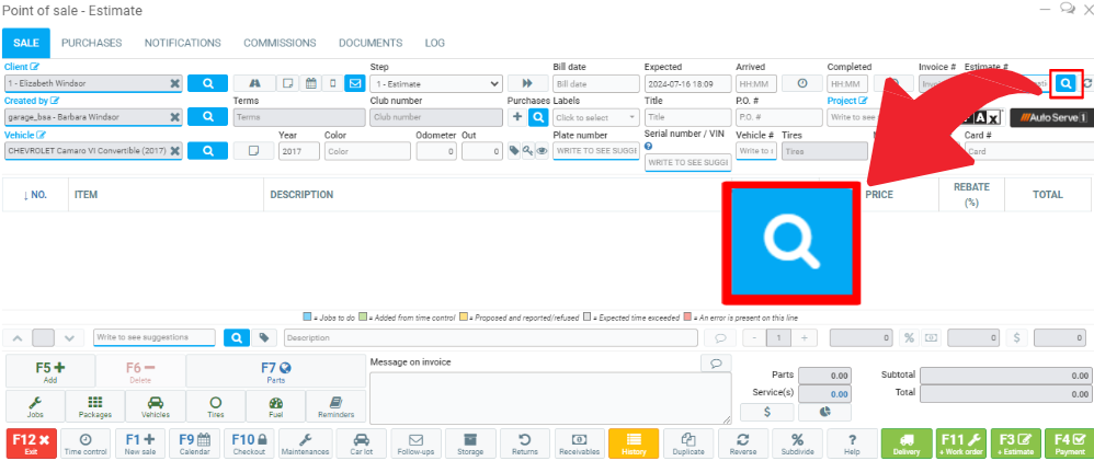 In the Point of sale window, click on the blue magnifying glass next to the estimate field.