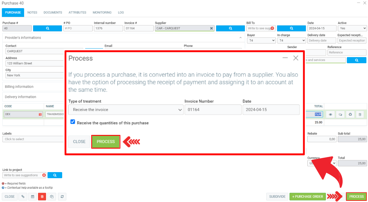 After clicking on the + sign, another purchase window will open. It is necessary to select the supplier, the products and services.