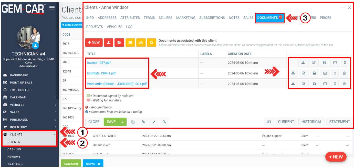 Click on the menu on the left, on the Clients > Clients tab, select the required client and open the Documents tab.