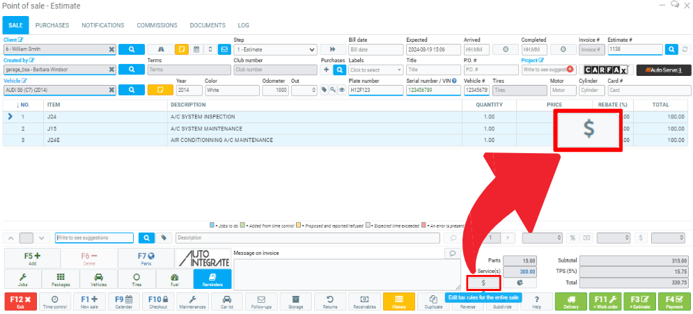 Then click on the $ symbol in the right corner of the Point of sale, below the Parts and Services prices.