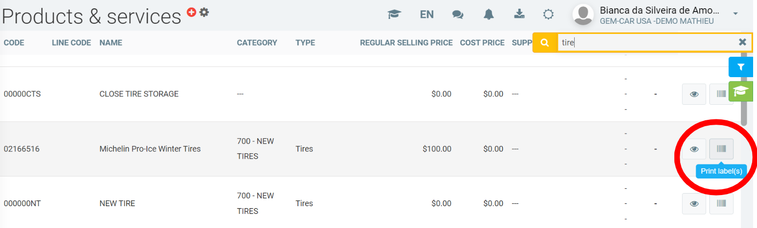 In the Inventory > Products & Services menu, you can print labels for these using the following button at the bottom of the window.